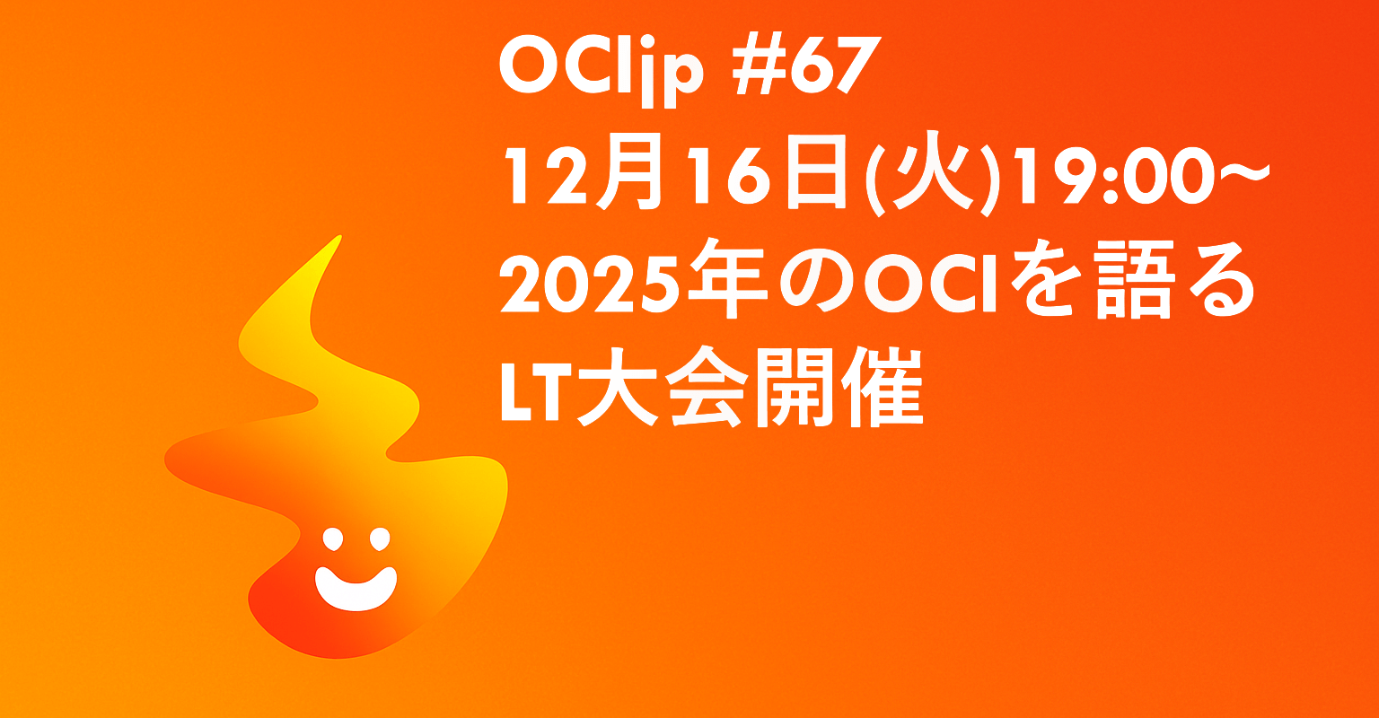 12月16日(火)19時よりOCIユーザーコミュニティ「OCIjp #67」を開催します。今回のテーマは“2025年のOCIをどう使いこなすか”。エンジニアが現場視点で語るLT大会で、OCIの実践知や最新トレンドをぎゅっと共有します。現地・オンラインどちらも参加歓迎。OCIをもっと知りたい人はぜひご参加ください!...